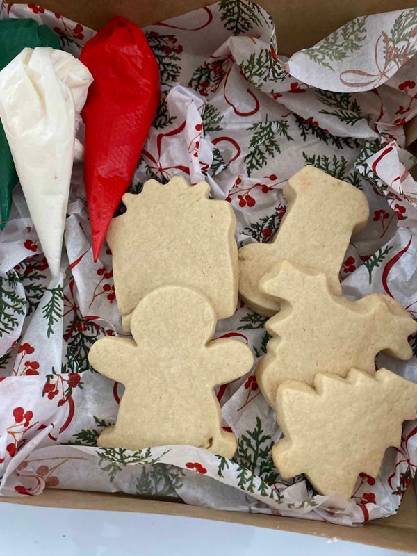 HolidaysSkip the store bought boxes this year and enjoy this perfect activity and tasty treat with Rose & Sugar cookies! Each kit comes with 5 smaller Christmas cookies perfect size for kids! It includes 5 colored icings (black, brown, green, red and white) all made fresh to order!